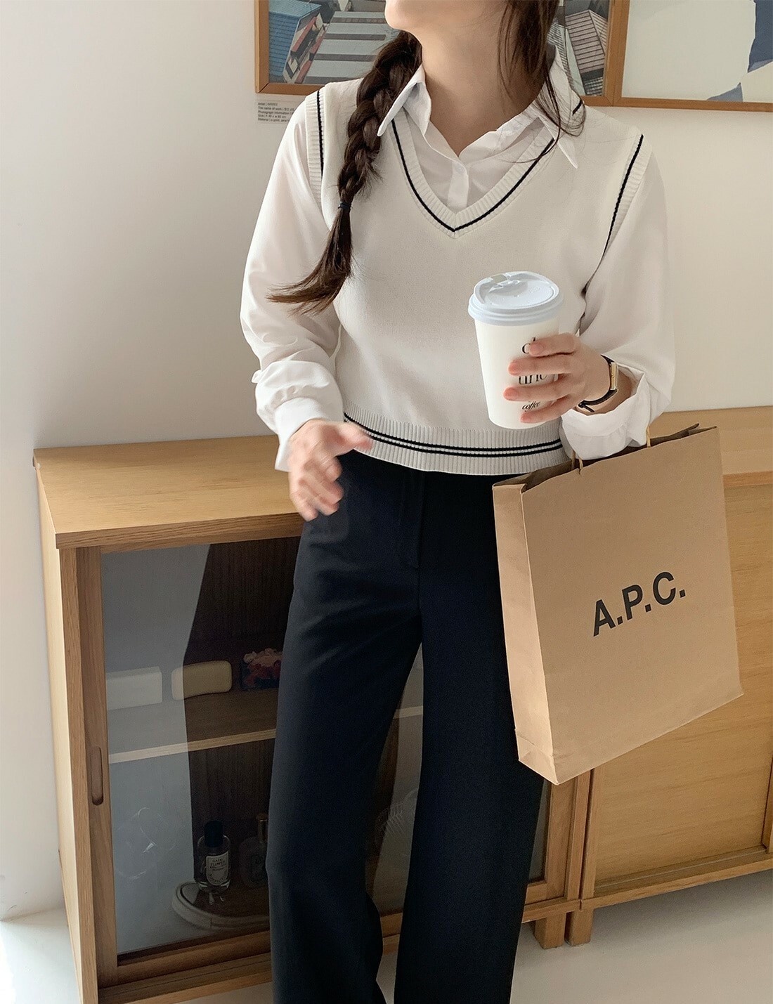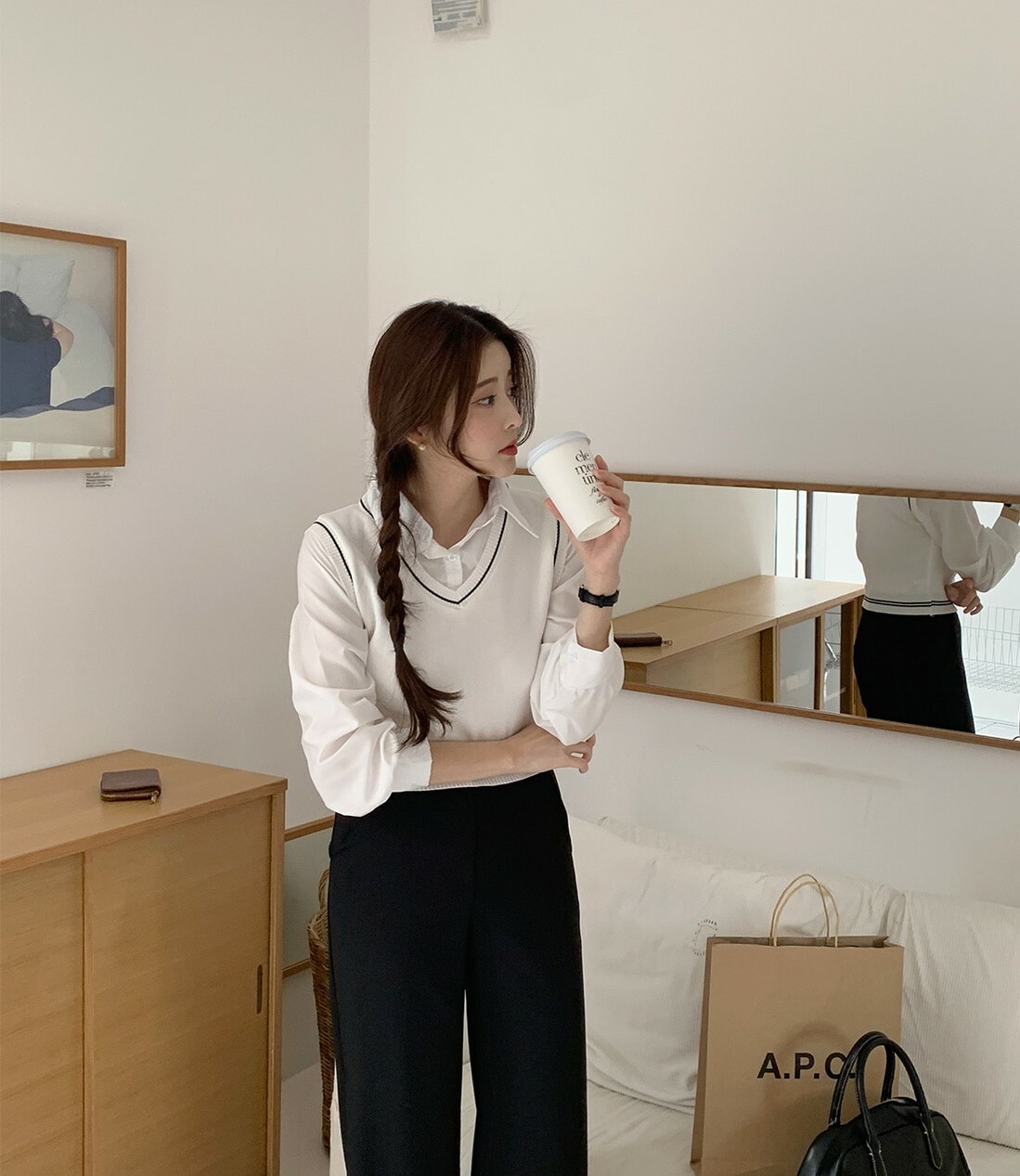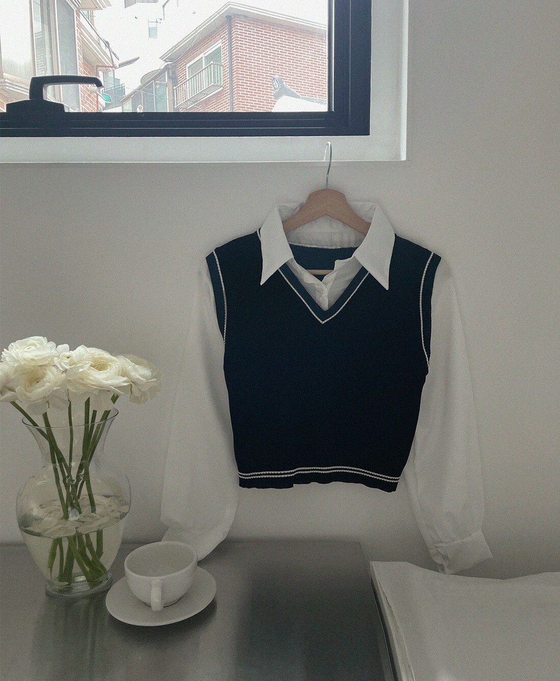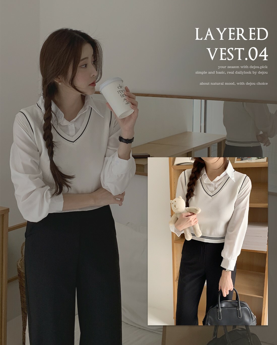 韓國Dejou授權 甜系假兩件式短版縮腰線條滾邊上衣
