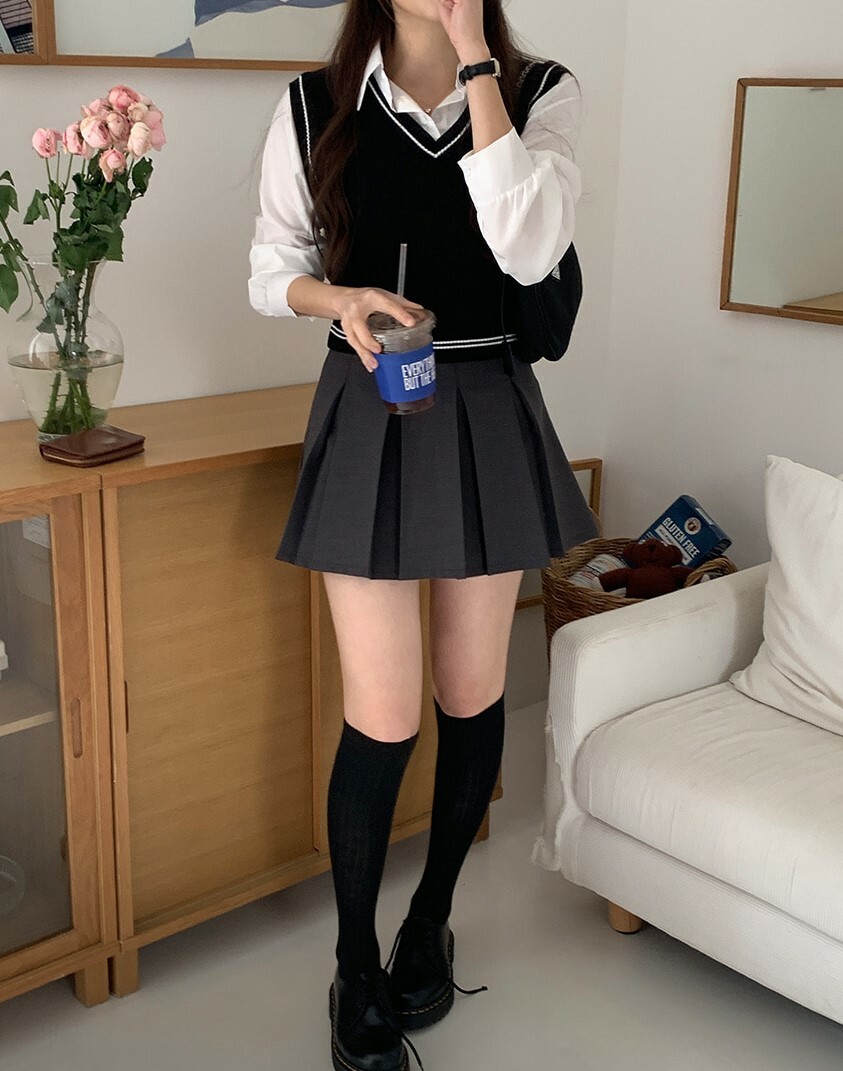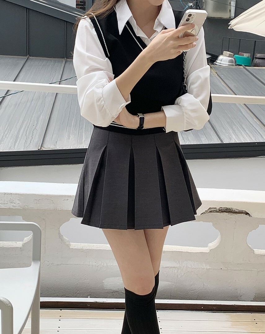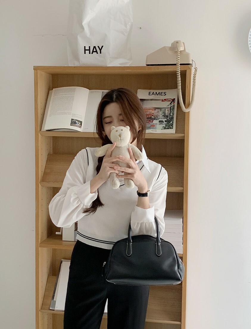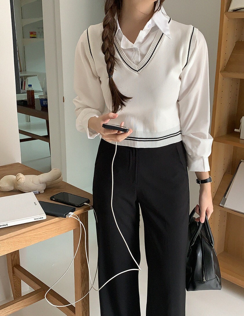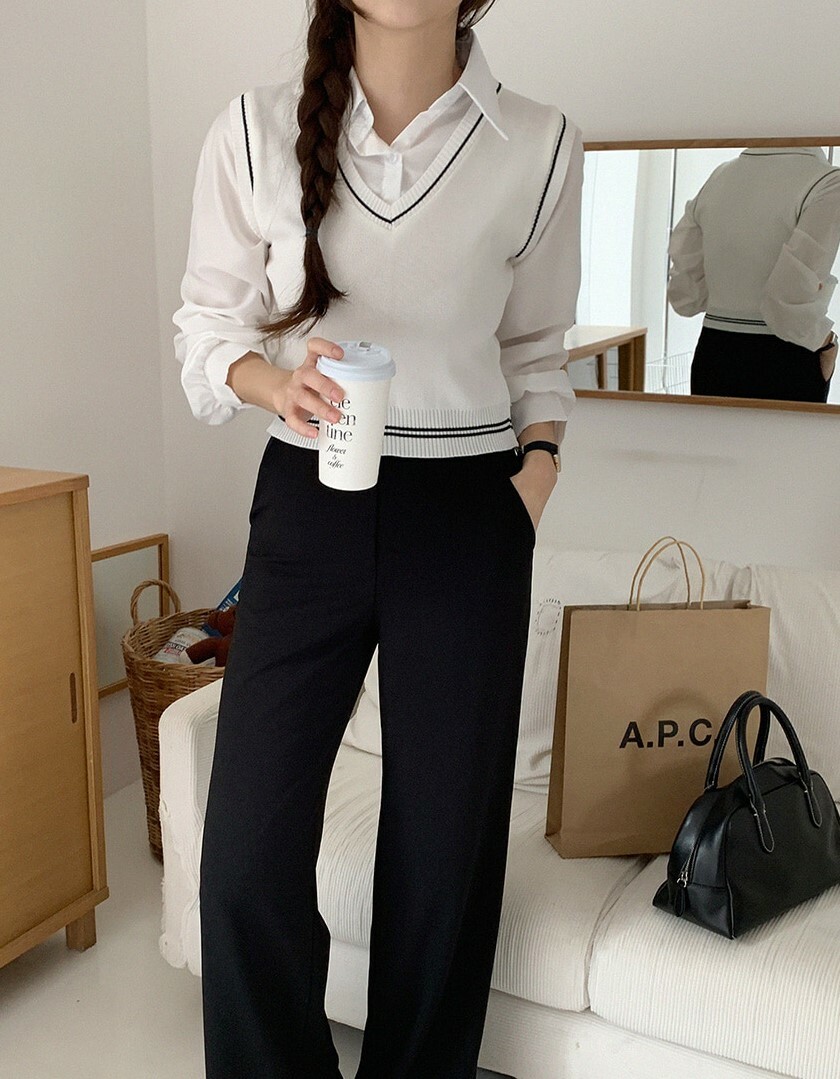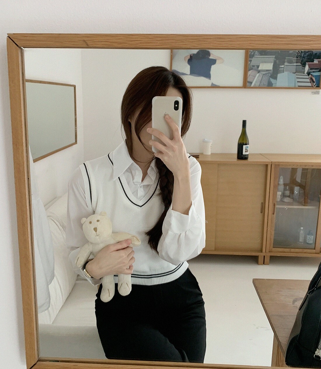 韓國Dejou授權 甜系假兩件式短版縮腰線條滾邊上衣