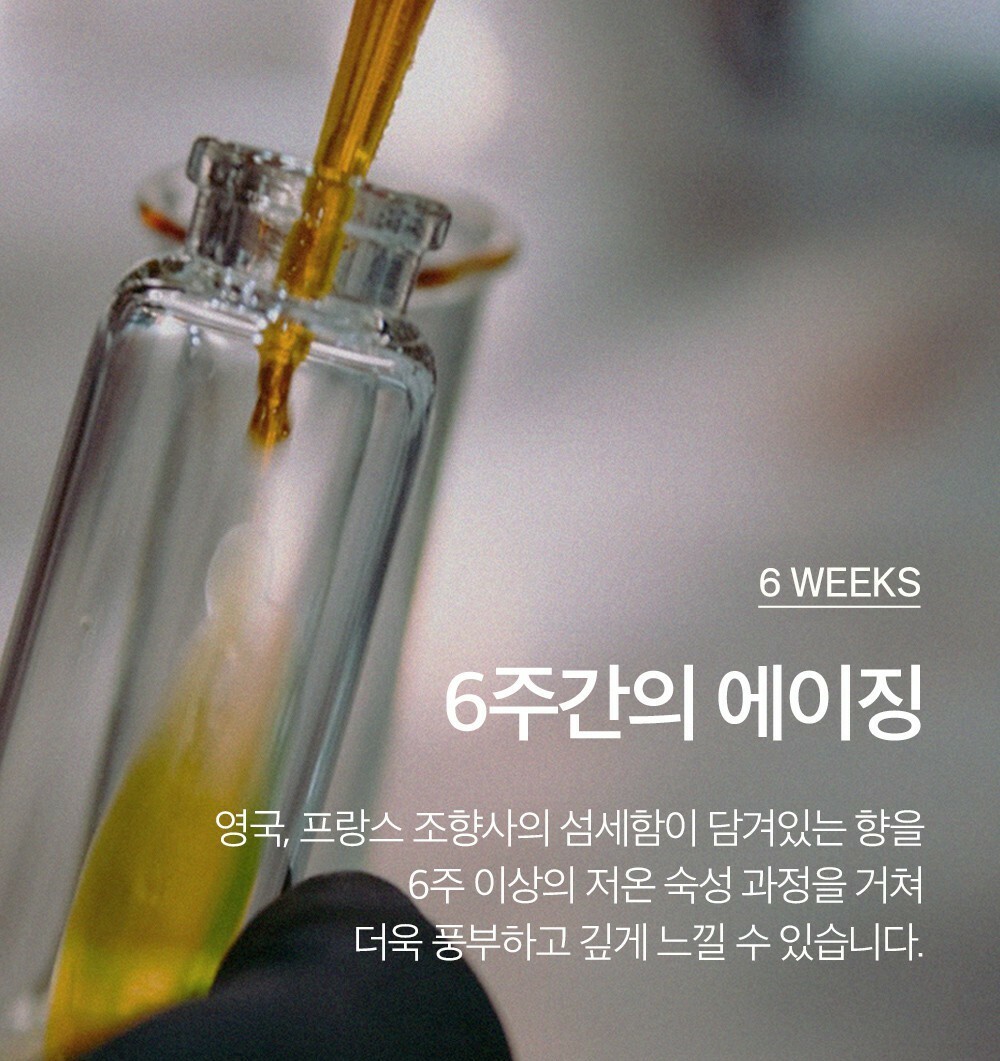 ① 6周熟成 - 英法調香師細膩的調味後,再經過6週以上的低溫熟成,可以感受到蘊含濃郁和深沉的香氛。