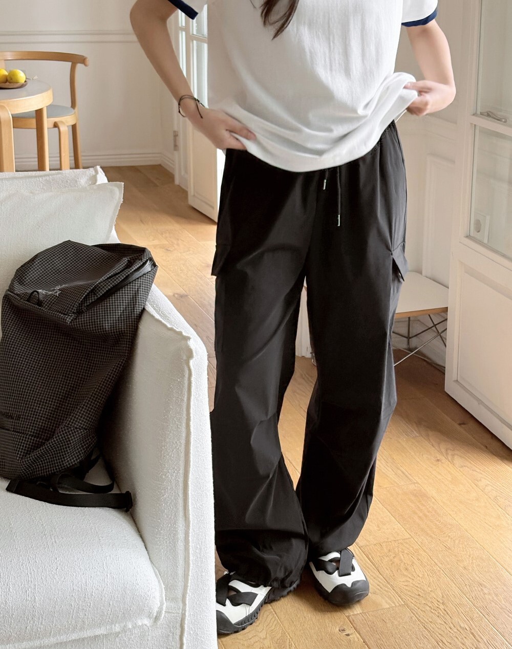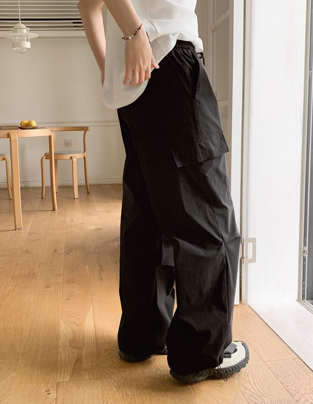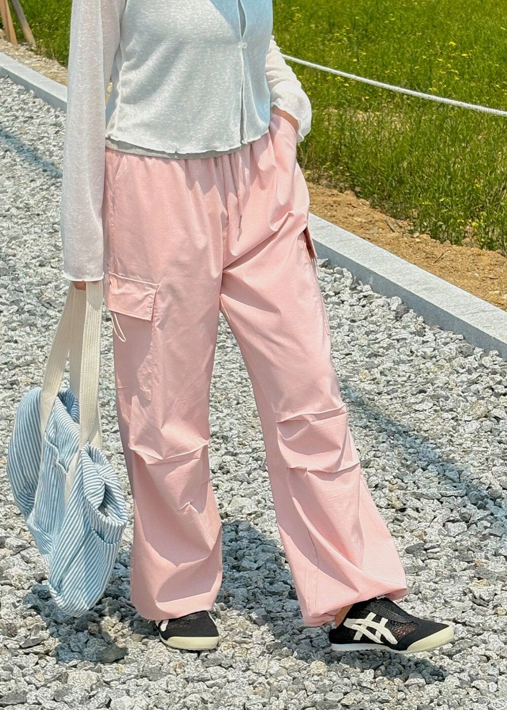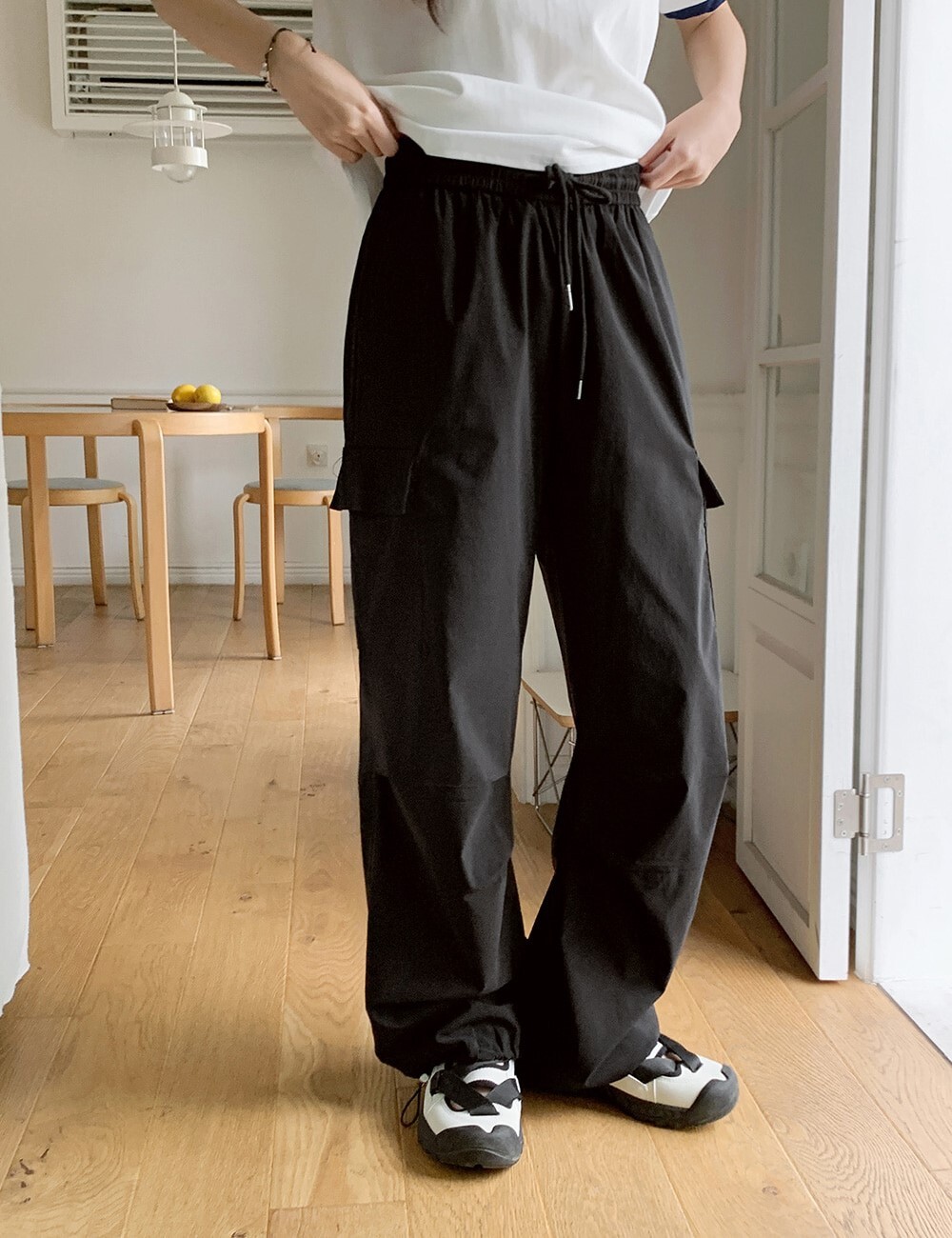 ■ 總長101cm 單面腰寬36cm(鬆緊) 單面臀寬46cm 單面大腿寬33cm 褲檔長33cm 褲口寬26cm(可調節)